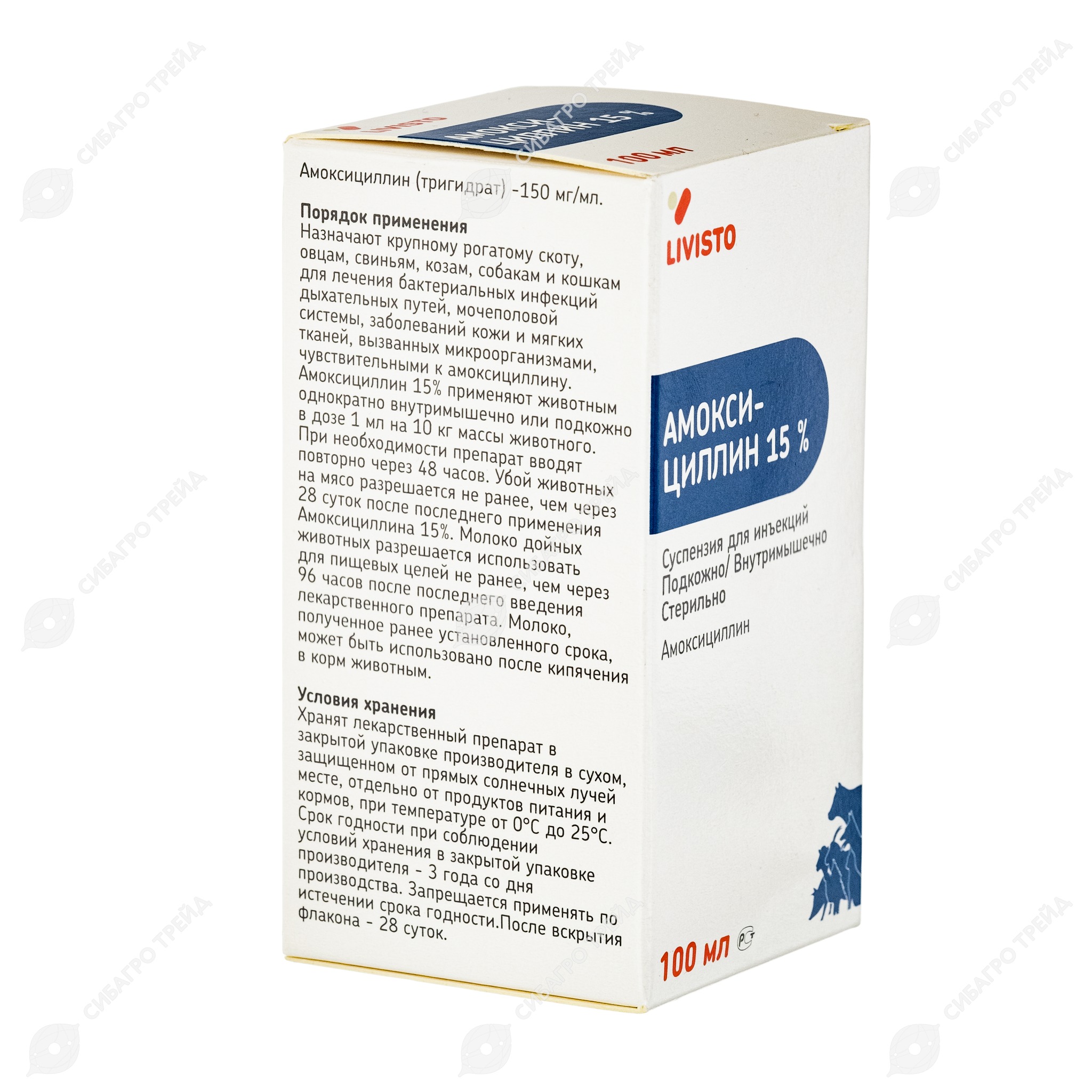 Амоксициллин 150 применяют для лечения крупного рогатого скота, мелкого рогатого скота, свиней при инфекционных болезнях желудочно-кишечного тракта, дыхательных путей, мочеполовой системы . . .
