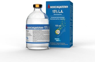 Амоксициллин 15% - Антибактериальный лекарственный препарат на основе амоксициллина в форме тригидрата в виде инъекционной суспензии для лечения животных: крупного и мелкого рогатого скота, свиней, собак и кошек при инфекционных заболеваниях бактериальной этиологии .