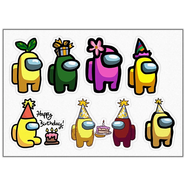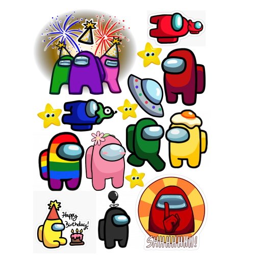 Амонг Ас 12 картинка для торта . Обзор . Отзывы 0 . Герои высотой 7 см . При желании можно добавить надпись, изменить размеры картинки . Размер листа: формат А4 (макс . 20х28 см) Время хранения сахарной картинки - до 1 месяца . Время хранения вафельной картинки - до 6 месяцев .
