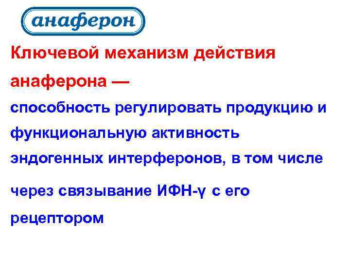 С одной стороны, Анаферон избирательно повышает способность клеток производить ИФН-α и ИФН-γ в ответ на инфекцию; кроме того он повышает функциональную активность клеток, участвующих в раннем противовирусном ответе, например, макрофагов .