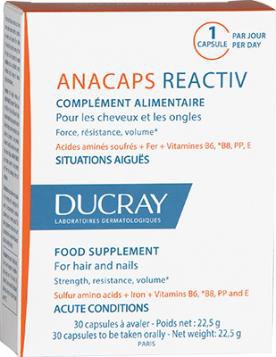 Описание Безплатна доставка над 58 лв . Анакапс Реактив е хранителна добавка, разработена от дерматологични лаборатории Ducray, за възстановяване жизнеността на косата при реактивен косопад . Съдържа желязо, витамини В6,В8,Е и PP, сяра-съдържащи аминокиселини цистин и метионин . . .