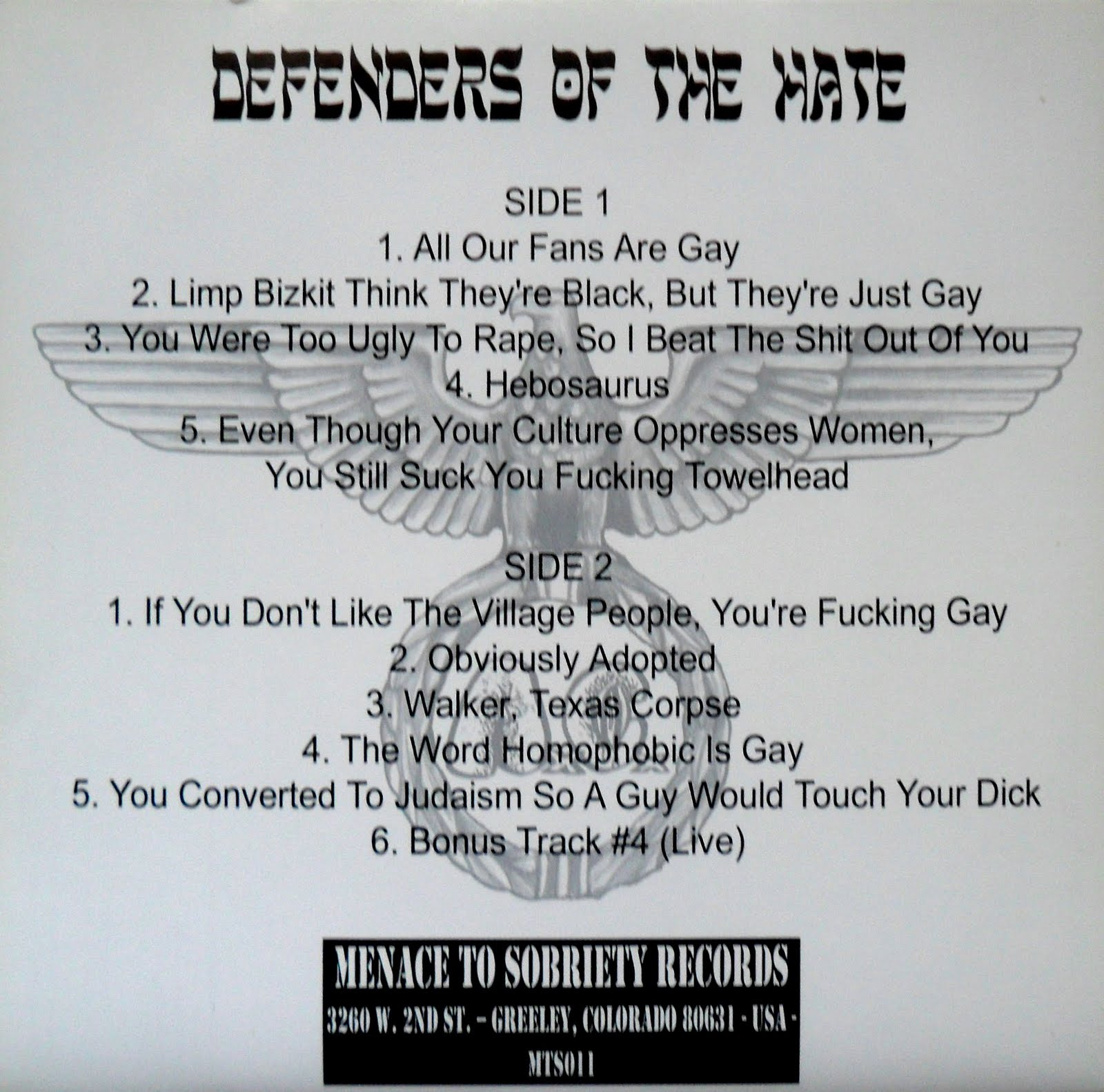 9 . The Word Homophobic Is Gay 10 . You Converted To Judaism So A Guy Would Touch Your Dick 11 . Bonus Track #4 12 . You Quit Doing Heroin, You Pussy 13 . Fred Shitbreath 14 . Beating Up Hippies For Their Drugs At A Phish Concert 15 . Anyone Who Likes The Dillinger Escape Plan Is A Faggot 16 . I'm Glad You Got Breast Cancer, Cunt 17 . The South Won . . .