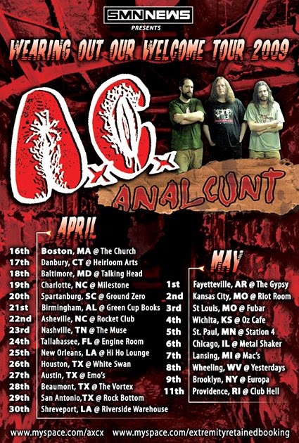 Most infamous for their name (the A .C . stands for Anal Cunt, believed to be taken from a G .G . Allin song), the band writes short grindcore songs that contain some of the nastiest song titles in music . "The Word Homophobic Is Gay" and "I Like Drugs and Child Abuse" are two of the tamer examples of what the band is capable of .