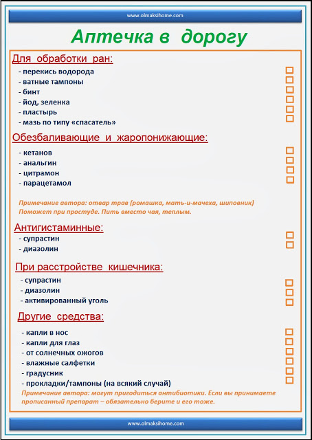 перекись водорода . бинт . вата . цитрамон . анальгин . средства от диареи . корвалол/валидол . градусник . прибор для измерения давления для старших членов семьи . глюкометр, если в доме есть больные диабетом