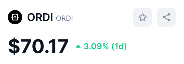 ORDI имеет стоимость в 70 долларов с капитализацией в 1,47 миллиарда долларов. В топе среди других криптовалют актив занимает 55 место.