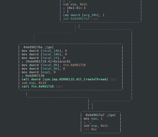 Итак, похоже что она сравнивает аргумент с числом 1, если выражение ложно, тогда мы возвращаемся и, скорее всего, программа завершается. Тем не менее, если выражение истинно, мы вызываем функцию CreateThread с fcn.6d981710 в качестве параметра. Это создаст поток, который должен запустить то, что делает fcn.6d981710. Затем вызывается таинственная функция и происходит выход. Следующим шагом может быть выяснение, что это за таинственная функция и что она делает.