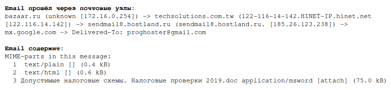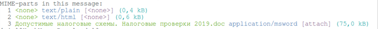Строки с [attach] показывают вложенные в email файлы. В данном случае файл называется «Допустимые налоговые схемы. Налоговые проверки 2019.doc», его тип application/msword, то есть это документ MS Word и его размер 75,0 kB.
