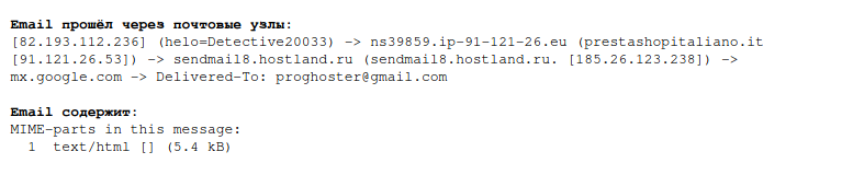 Выводы: источником письма был IP адрес 82.193.112.236 или хост ns39859.ip-91-121-26.eu (91.121.26.53). Хотя письмо предназначено для email адреса на домене *@mi-al.ru, в конечном счёте оно пришло на почтовый сервер Gmail (mx.google.com), причём для адреса proghoster@gmail.com — то есть произошла переадресация почты.