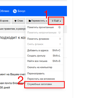У mail.ru нужно нажать кнопку Ещё, а затем выбрать пункт меню Служебные заголовки: