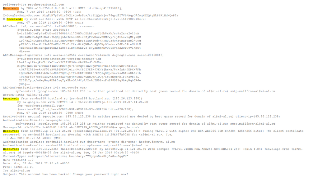 Received является самой важной частью заголовка электронного письма и обычно самой надёжной. Эти строки формируют список всех серверов/компьютеров через которые путешествовало сообщение, чтобы добраться до вас. Строки received лучше читать снизу вверх. То есть первая строка «Received:» — это ваша собственная система или почтовый сервер. Последняя строка «Received:» — это откуда исходит письмо. Каждая почтовая система имеет свой собственный стиль строки «Received:». Каждая отдельная «Received:» обычно показывает машину, с которой получена почта, и машину, которая получила почту.