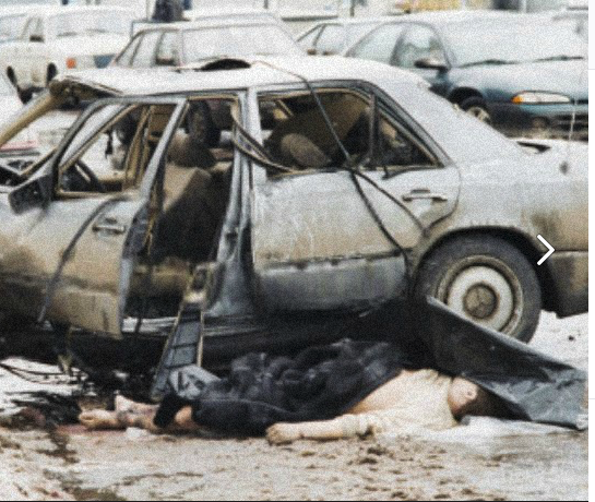 На снимке : Взорванный автомобиль «Мерседес» Анатолия Францкевича на Кутузовском проспекте. Москва, 21 марта 1997 года.