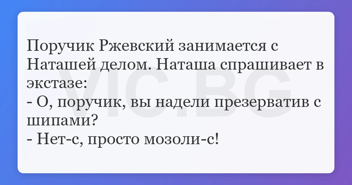Анекдоты про Наташу Ростову и поручика Ржевского Танцует на балу Наташа Ростова с поручиком Ржевским . Вдруг Наташа говорит: — Поручик! Что это так дурно пахнет? — Вероятно, это мои портянки . — Так снимите их сейчас же! Поручик тут же устремился в соседнюю залу и вернулся минут через пять . — Поручик! Откуда опять эта вонь? Вы сняли ваши портянки?