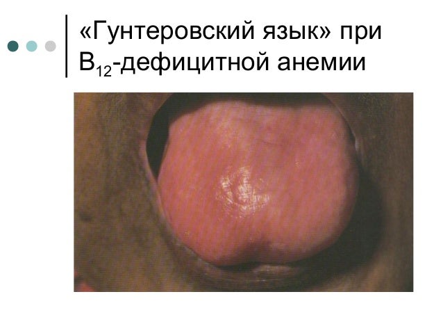 Гунтеровский . Глоссит Меллера — Гунтера - это форма заболевания, при которой у пациента визуально гладкий язык . Основные причины: дефицит фолиевой кислоты и витамина В12, анемия . На фото . . .