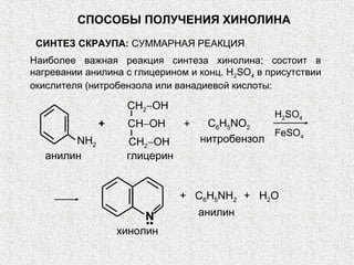 В колбе на 50 мл смешивают нитробензол, анилин, глицерин и серную кислоту . Затем осторожно нагревают маленьким пламенем газовой горелки до начала реакции, становящейся далее очень энергичной .