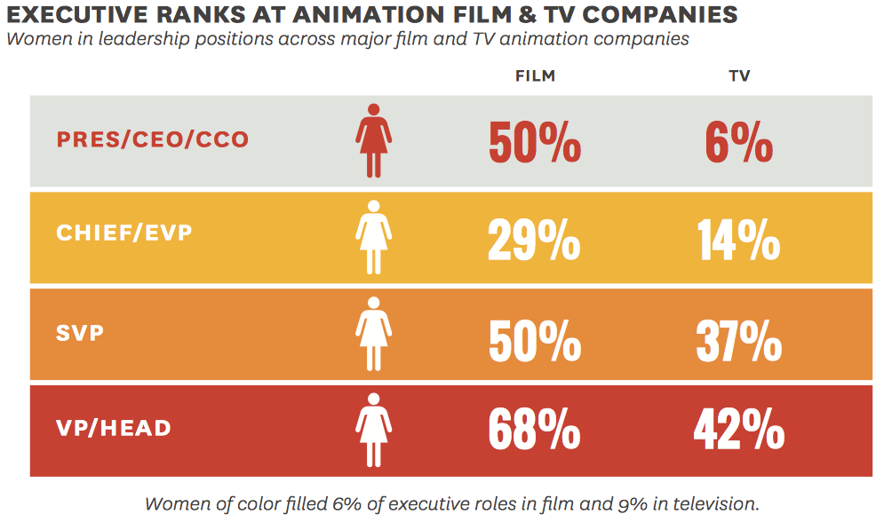Women in leadership positions across major ο¬lm and TV animation companies . . . Nine percent of writers (n=40 out of 423) across the 120 top animated films were women . Only 6 or 1% of these writers were women of color (4 Asian, 1 Latinx, 1 multiracial) . In 100 animated TV series, 25%