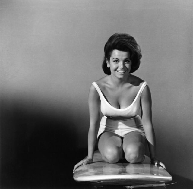 When she was cast in her first beach movie, Walt Disney requested that she only wear modest bathing suits and keep her navel covered. However, she wore a pink two-piece in Beach Party, a white two-piece fishnet suit in the second film (Muscle Beach Party) and a blue and white bikini in the third (Bikini Beach). All three swimsuits bared her navel, particularly in Bikini Beach, where it is visible extensively during close up shots in a sequence early in the film when she meets Frankie Avalon's "Potato Bug" character outside his tent.[19]