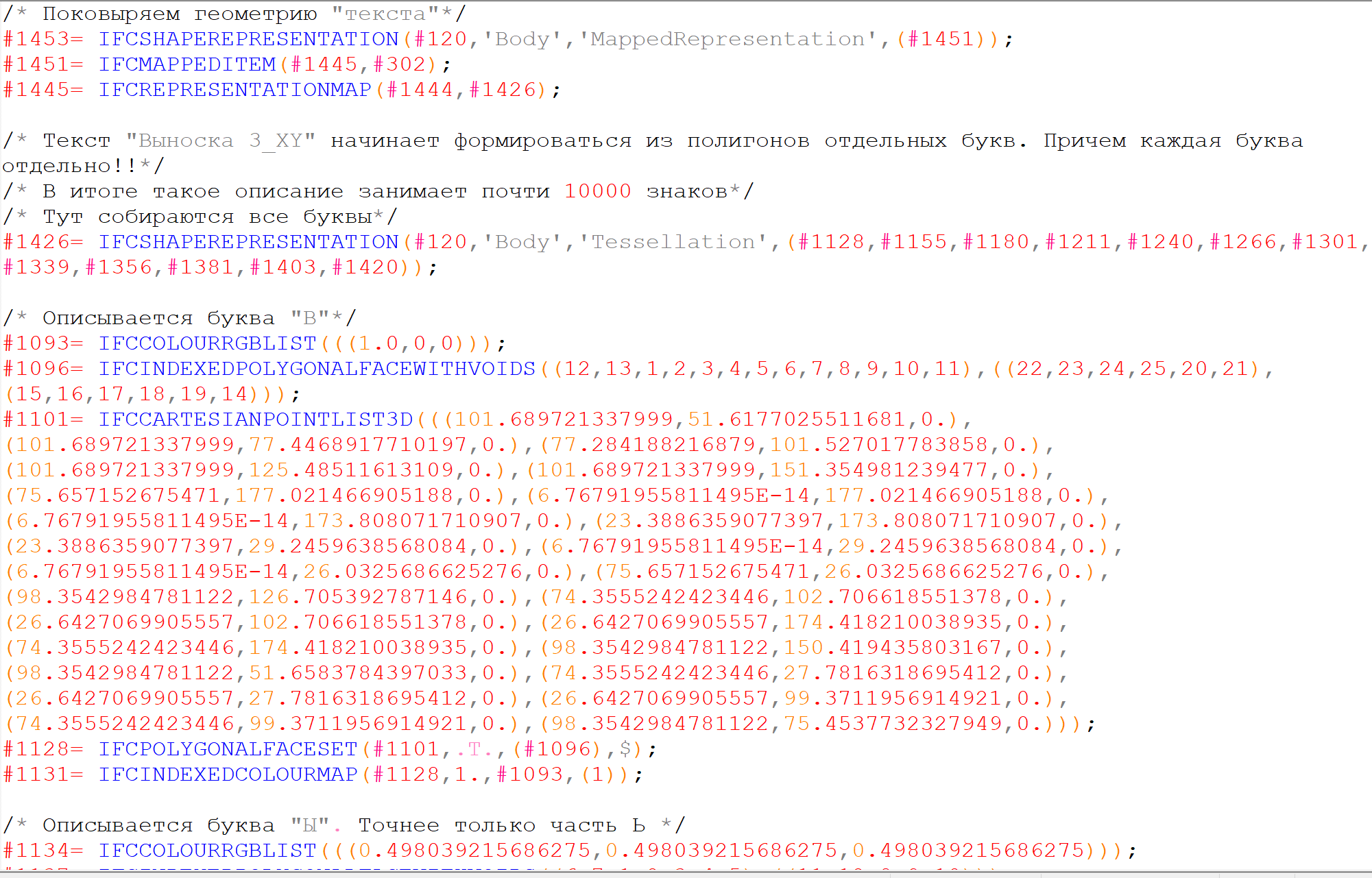 С геометрией ''Текста'' куда веселее. Ожидалось найти в файле ''Выноска 3_ХY'' в виде значения атрибута элемента, которое и должно отображаться в выноске. Но фактически каждая буква или символ описывается замкнутым полигоном с учетом всех поворотов и изгибов. При этом сам полигон строится по точкам, которые также записаны в файле.