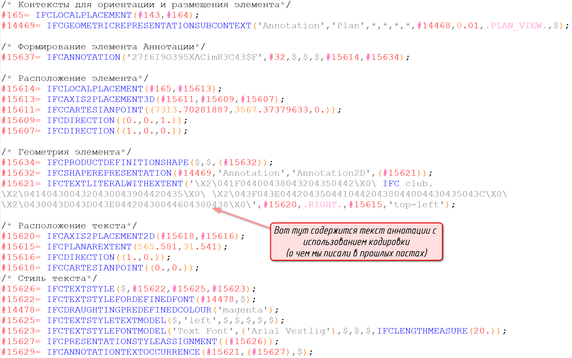 В противовес такому подходу посмотрим на файл IFC, который содержит стандартный класс IfcAnnotation.