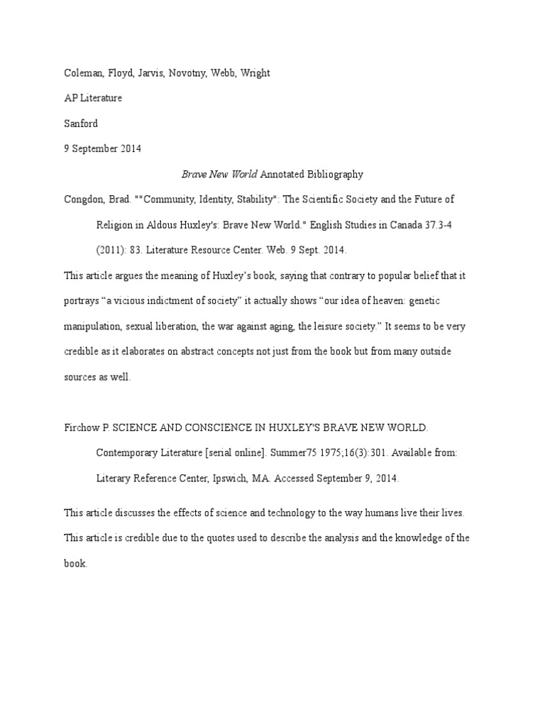 Brave New World Annotated Bibliography . Congdon, Brad . ""Community, Identity, Stability": The Scientific Society and the Future of . Religion in Aldous Huxley's: Brave New World ." English Studies in Canada 37 .3-4 . (2011): 83 . Literature Resource Center . Web . 9 Sept . 2014 . This article argues the meaning of Huxleys book, saying that contrary to . . .