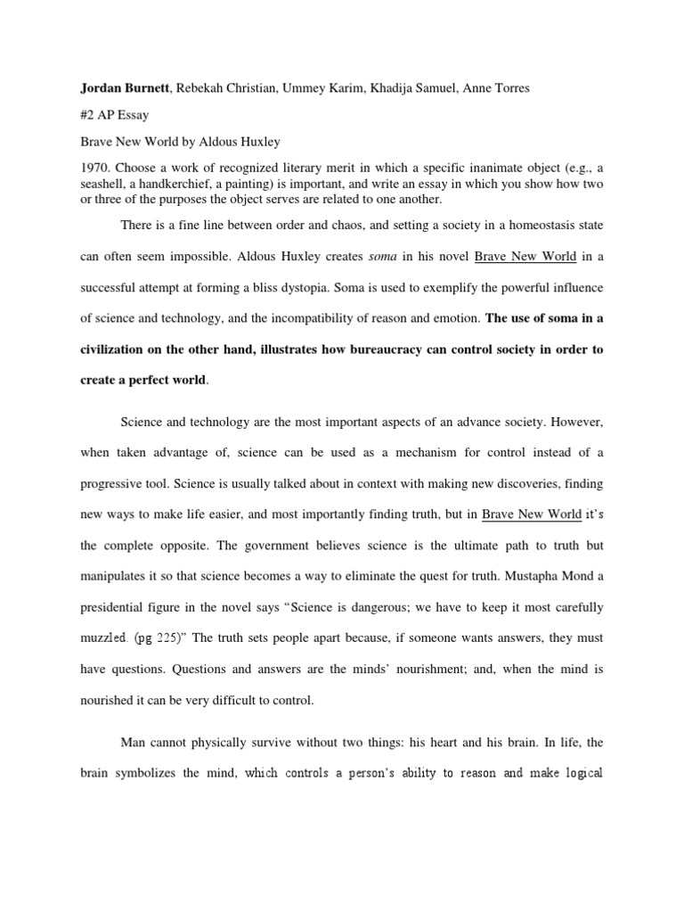 Essays for Brave New World . Brave New World essays are academic essays for citation . These papers were written primarily by students and provide critical analysis of Brave New World by Aldous Huxley . Methods of Control in 1984 and Brave New World ; Cloning in Brave New World ; God's Role in a Misery-Free Society; Character Analysis: Brave New World