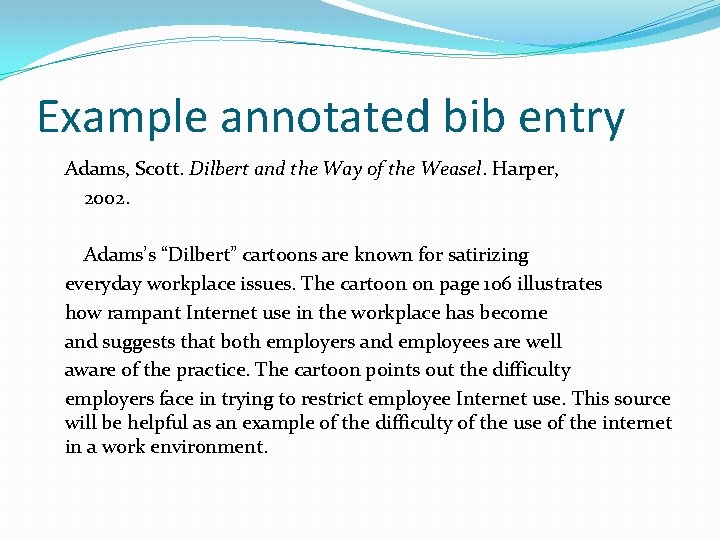 An Annotated Bibliography Adams, Scott . Dilbert and the Way of the Weasel . New York: Harper, 2002 . Print . Adams's "Dilbert" cartoons are known for satirizing everyday workplace issues . The cartoon on page 106 illustrates how rampant Internet use in the workplace has become and suggests that both employers and employees are well