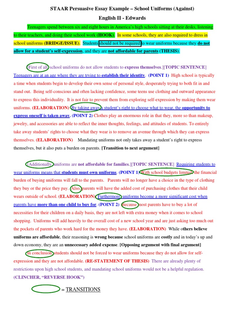 2 School Uniforms : Annotated Bibliography Working thesis statement: Even though school uniforms violates the student's rights to freedom of expression, it should not matter how a child is dressed because wearing school uniforms encourages discipline and improves attendance, it eliminates bullying and diminishes the economic and social standards between students which causes conflict and the . . .