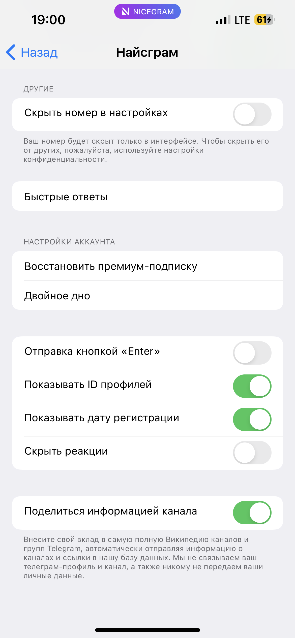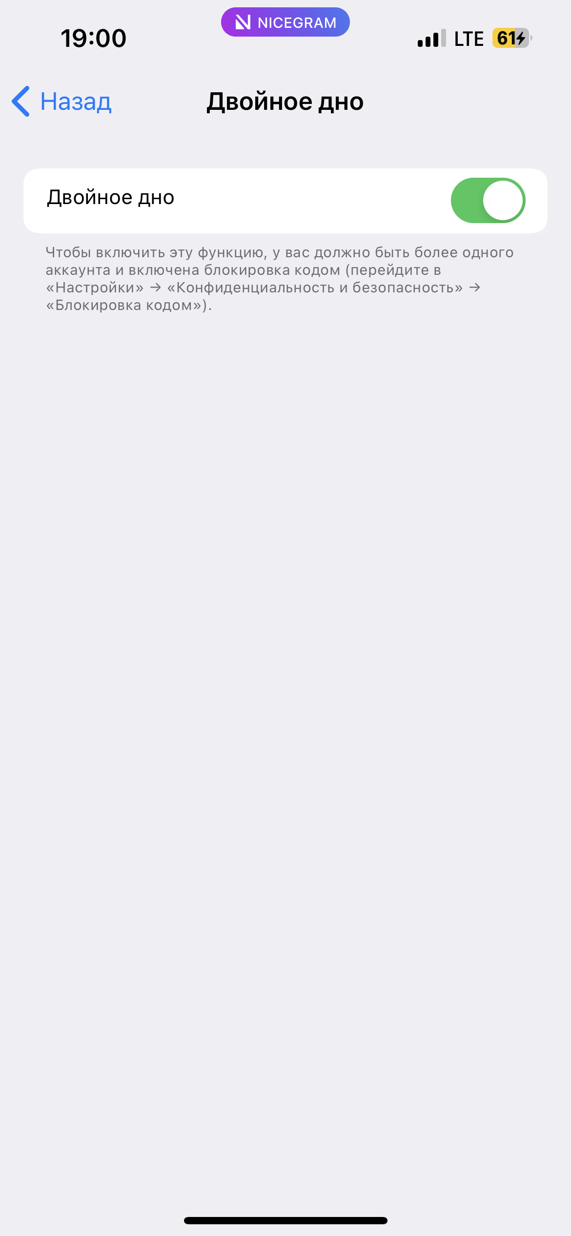 4. В некоторых неофициальных версиях Телеграм (например, в Nicegram) присутствует возможность создания нескольких скрытых аккаунтов, так же, как эта возможность реализована в системе Андроида для создания нескольких учетных записей. Только вы, зная секретный пароль, сможете открыть нужный аккаунт, а все остальные будут видеть лишь тот аккаунт, который вы им покажете, если вас попросят разблокировать приложение.
