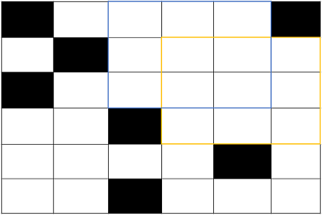 Листок бумаги размером 6*6. Черным помечены закрашенные клетки, белыми - чистые клетки. Как хорошо видно по рисунку, наибольший "незакрашенный" квадрат, ктр можно вырезать имеет размер 3*3. А кол-во способов, ктр-м это можно сделать, равно 2 (помечен синий и желтый квадрат).