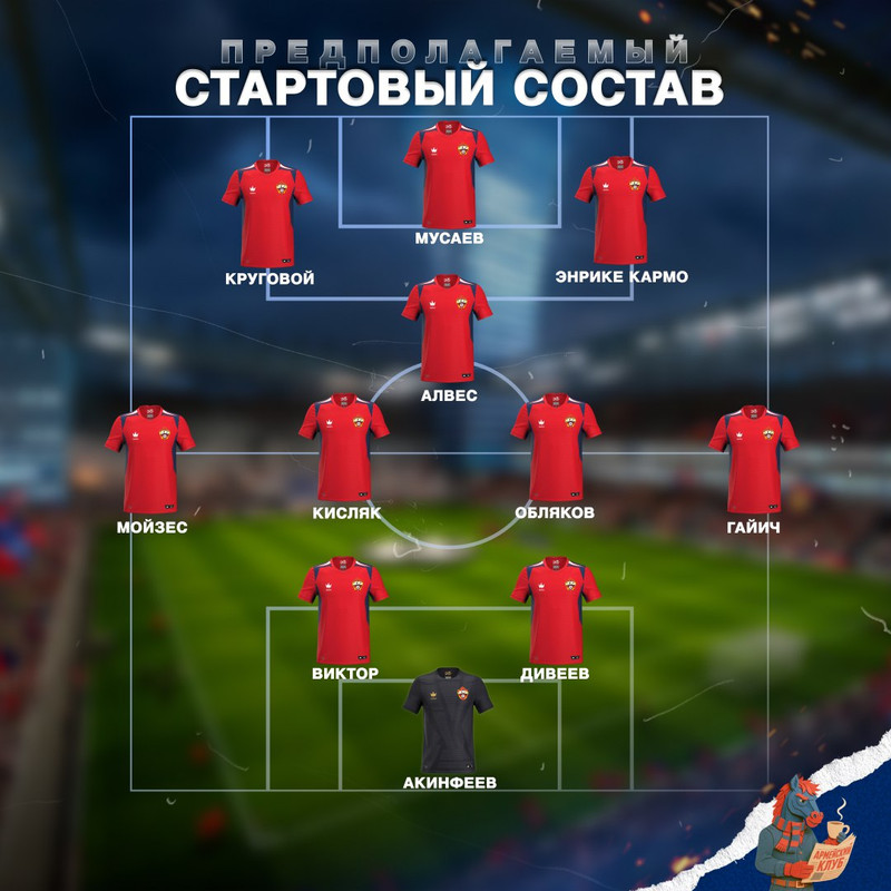 На флангах атаки ставим Кругового и Кармо. Почему ? Юный Энрике здорово выглядел, хотя видно отсутствие опыта. Тем не менее его движение вкупе с неплохим дриблингом выглядит всяко выигрышнее попыток в навесы от Даниила. По принципу выбора сильнейших ставим налево как раз таки Кругового, потому что Шуманский огорчает. Буквально второй футболист после Аллерандро, которого видеть сейчас совсем не хочется. Без негатива к белорусу, но быть сильнее него может быть кто угодно : хоть немного потерянный Круговой, хоть юный Сериков. Тем не менее ставим на опыт и привычку Фабио минимально ротировать состав. А, хоть Глебов и уже тренируется с командой, сомневаемся в его выходе даже на замену. Все же риск того не стоит.