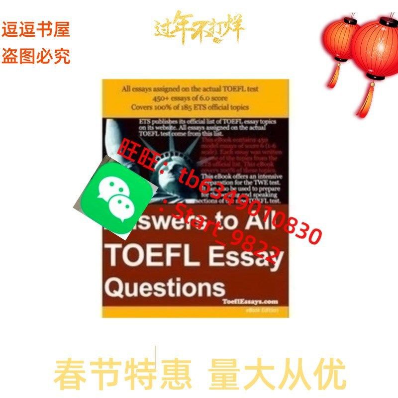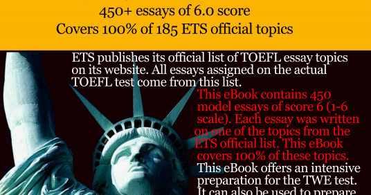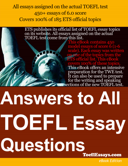 Answers to All TOEFL Essay Questions . ETS publishes its official list of TOEFL essay topics on its website . All essays assigned on the actual TOEFL test come from this list . This eBook contains 450 model essays of score 6 (1-6 scale) . Each essay was written on one of the topics from the ETS official list .