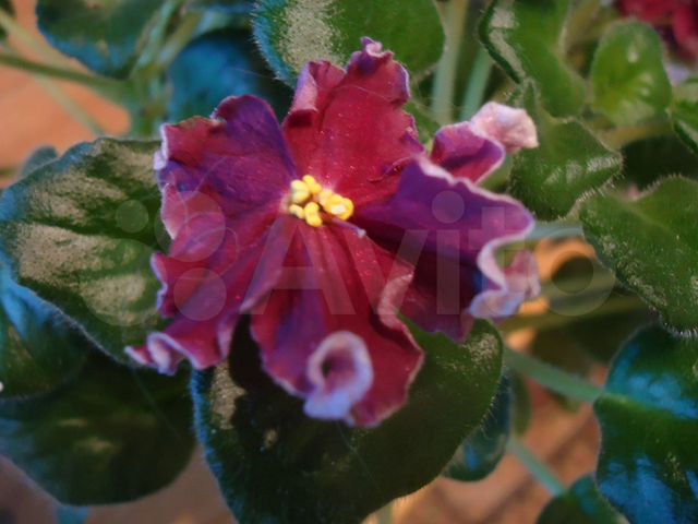 Фиалка ЛЕ-Антарес . Цветок: Рубиново-красные крупные звезды с витыми краями,увенчанные белой каймой . Темно- зеленые ровные листья . Цветы опадают, но держатся очень долго . Розетка:
