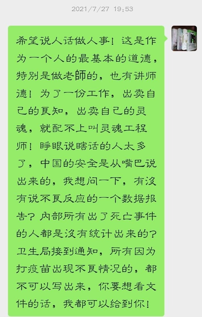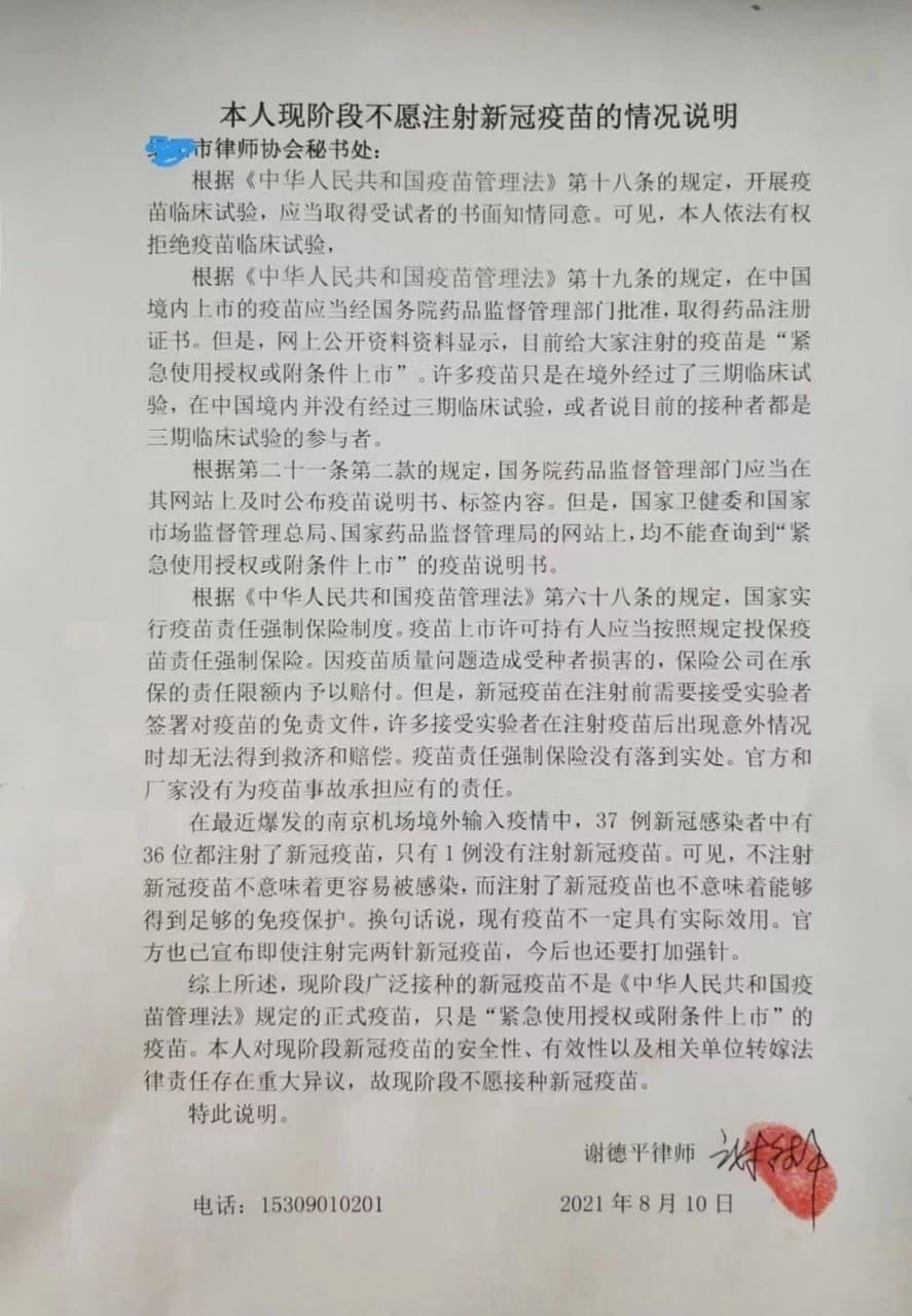 一、据官方媒体仅公布的资料显示(防火墙内唯一的信息源):现在的疫苗仅做了二次临床试验,生产应用的疫苗亦标明仅供临床研究用。接种疫苗造成的不良反应(包括引发其他疾病、死亡、伤残等)的统计数据没有向公众公布。我所知道的就有包括死亡案例在内多起事故。到目前为止,接种疫苗后会产生什么问题,产生问题后政府会怎样处理和保障,公民没有任何渠道获取,政府也从没有公布过。相反我们看到医院内部会议传出的消息是凡涉接种新冠疫苗就诊的不能轻易写入病历和诊断书当中。