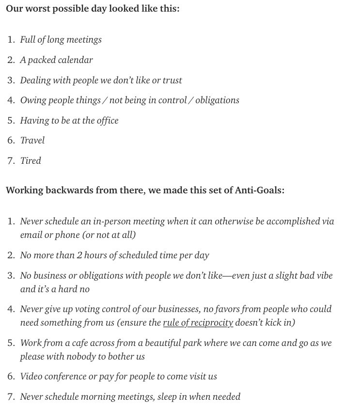 In his original blog post, Andrew Wilkinson has a great example of using anti-goals to design his work.