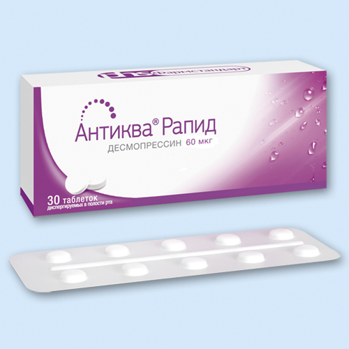 Антиква Рапид . Торговое наименование препарата . Антиква Рапид . Международное непатентованное наименование . Десмопрессин . Лекарственная форма . таблетки диспергируемые в полости рта . Состав