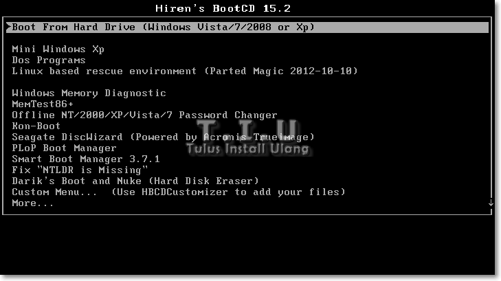 TIU ⌨️Hiren’s Boot CD adalah software utilities boot yang programnya berjalan pada CD atau DVD ataupun dari flashdisk yang menjadi sebuah sistem. Didalamnya terdapat tools beberapa macam program untuk kebutuhan sistem operasi. Software ini mirip dengan DLC Boot.