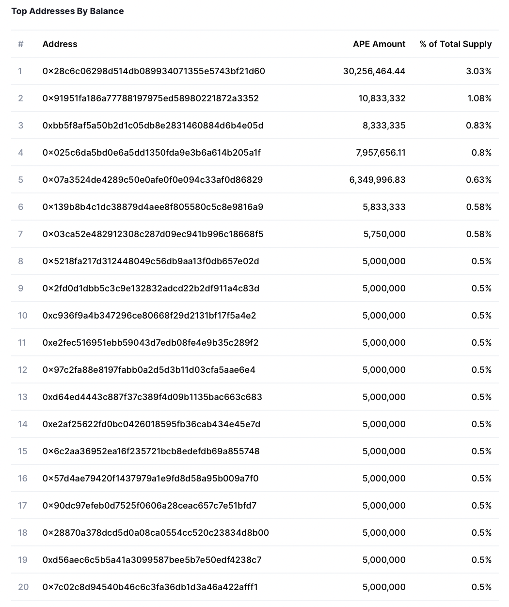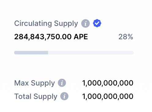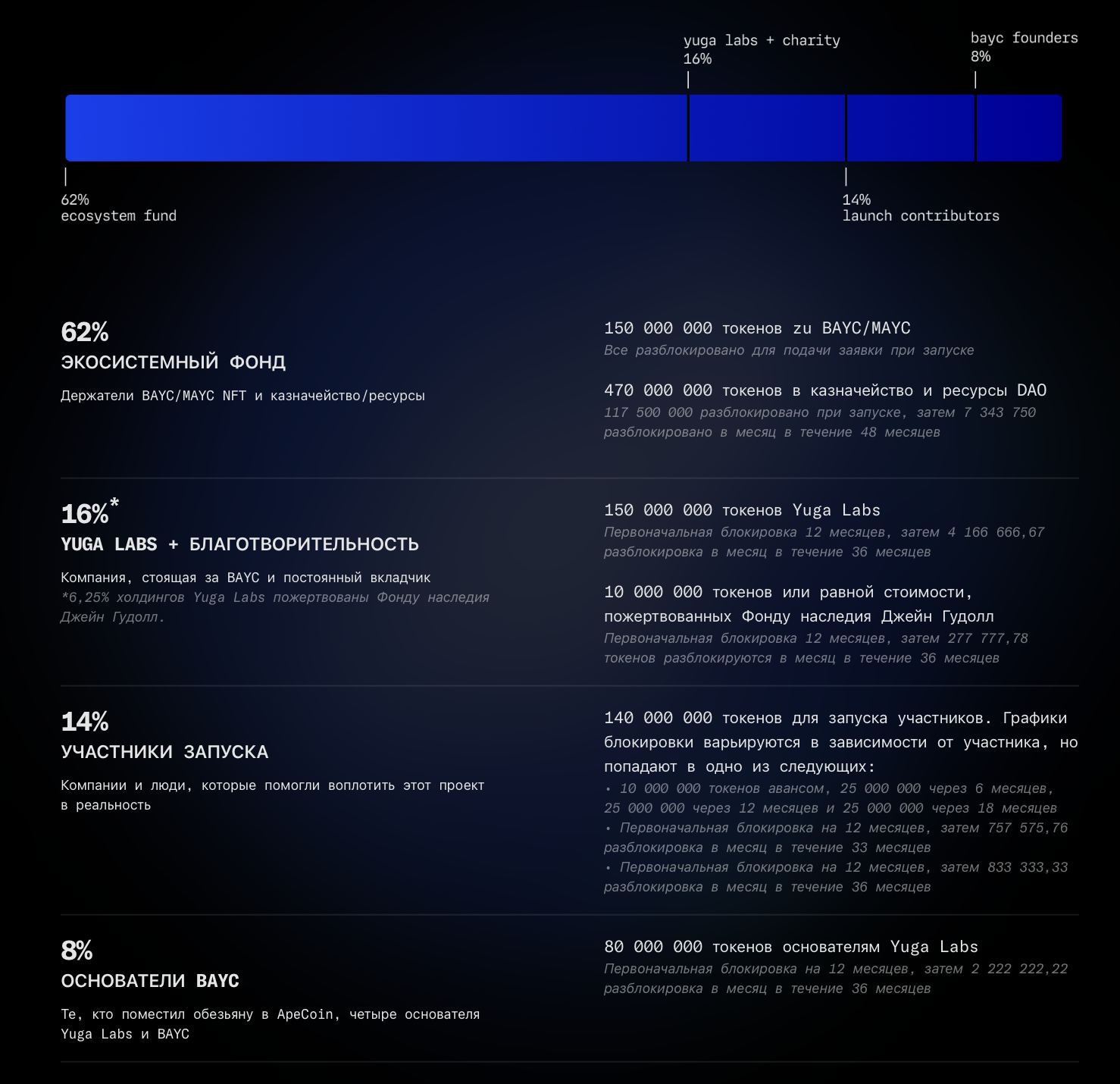 Из 1 миллиарда токенов ApeCoin, выпущенных при запуске, график поставок указан следующим образом:
