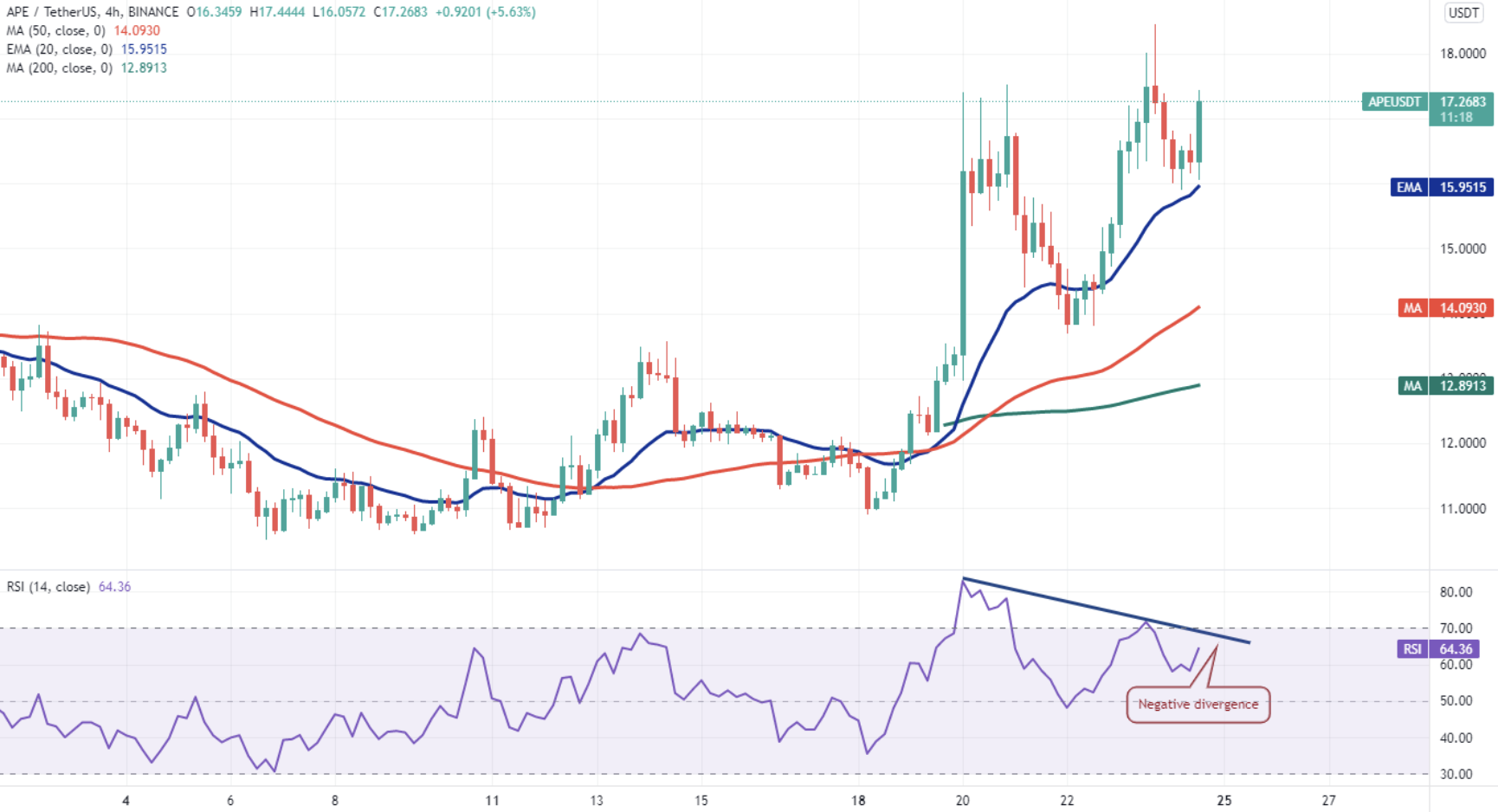 Появилась 20-дневная EMA (13,67$), и RSI находится в положительной зоне, что указывает на то, что быки находятся в действии. Существует незначительное сопротивление на уровне 18,44$, от которого APE/USDT откатилась 23 апреля. Цена поднялась с текущего уровня как мы видим, быки толкают пару выше 18,44 долларов. Пока добиваются успеха, пара может подняться до 20$, а затем до 24$.