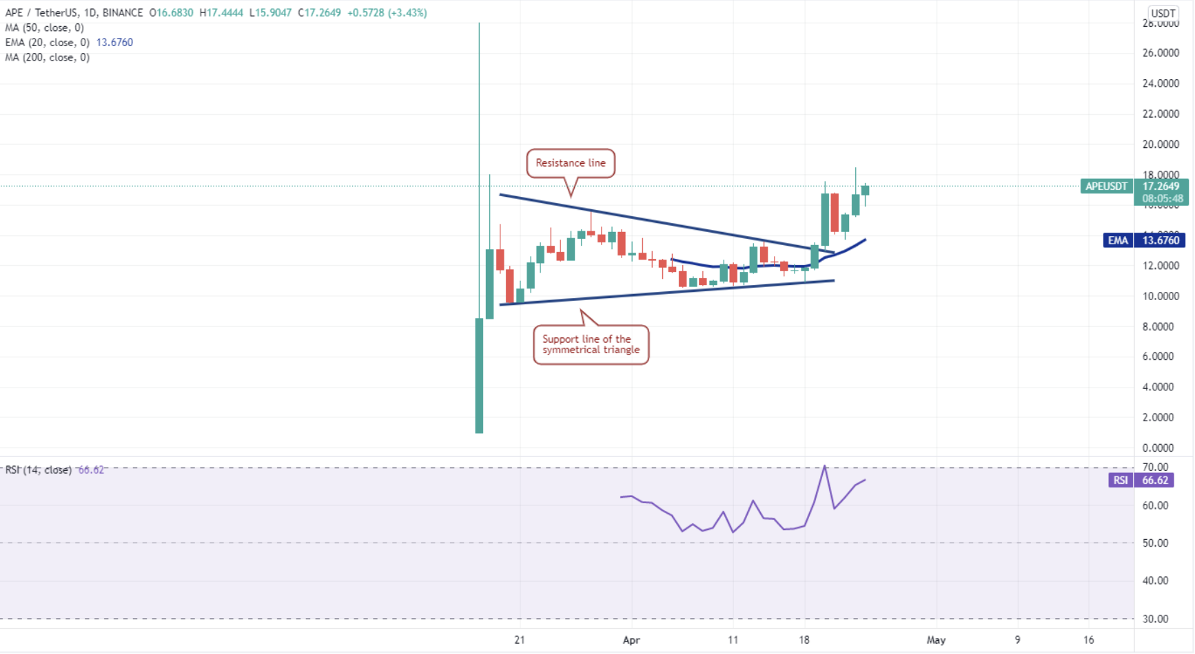 ApeCoin вырвался из симметричного треугольника 19 апреля, что указывает на то, что нерешительность между быками и медведями разрешилась в пользу покупателей.