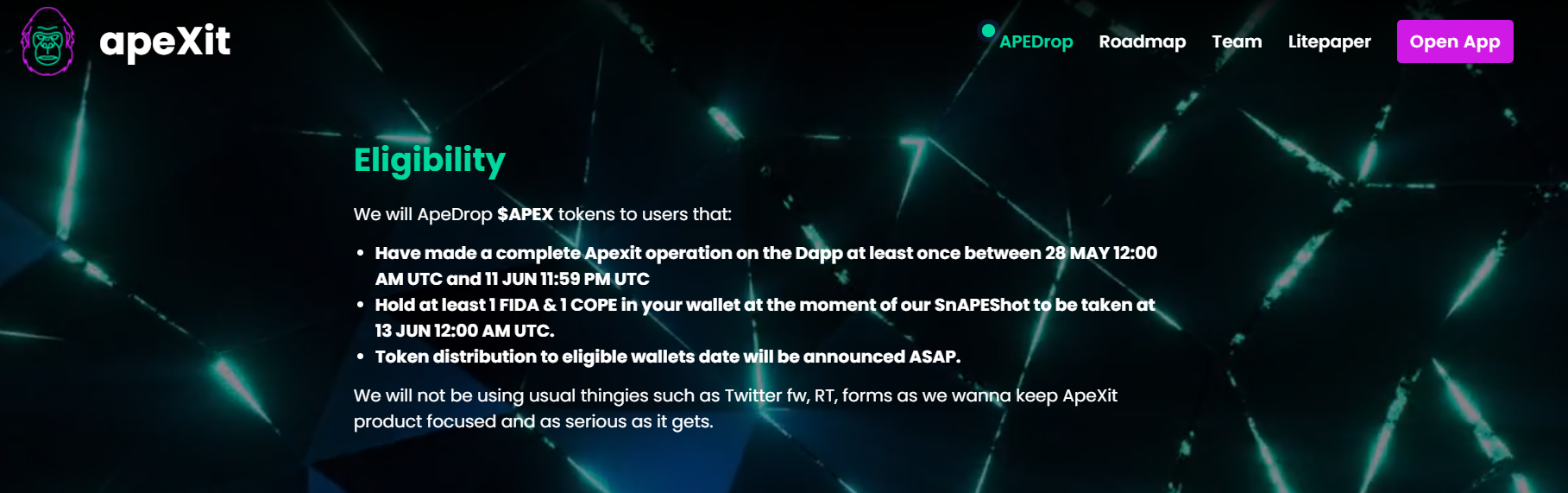 - Make a txn on ApeXit DApp at least once b/w 28 MAY 12:00 AM UTC and 11 JUN 11:59 PM UTC