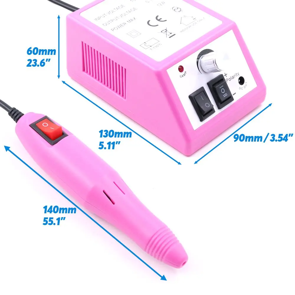 Универсальный набор для маникюра и педикюра. 10 насадок: сапфировый конус, сапфировый крупнозернистый диск, сапфировый длинный крупнозернистый конус, сапфировый мелкозернистый диск, сапфировая круглая насадка, фетровый конус, цилиндрическая насадка, насадка в форме пламени, насадка в виде иглы, насадка из наждачной бумаги. Плавная регулировка скорости (2000-5400 об/мин). Реверс. Светодиодная подсветка. Рукоятка с поверхностью Soft Grip.Защитный колпачок для ногтевой пыли. Сумка для хранения. Питание: сеть.