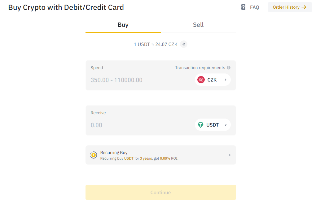 Затем переходим на "BINANCE" и выбираем метод оплаты "дебетовая/кредитная карта" czk - usdt - link