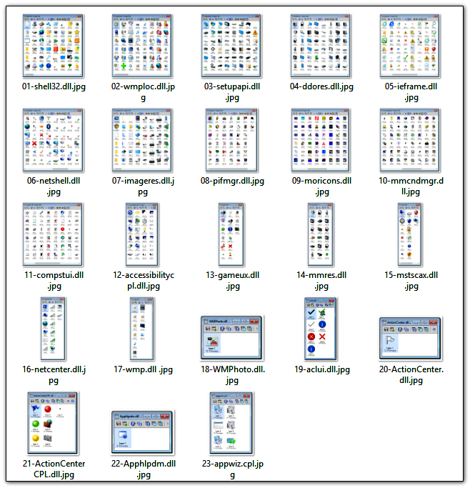 Los iconos de Windows se encuentran en una serie de archivos contenedores con extensión ¨.dll¨, ¨.exe¨, ¨cpl¨, ¨.ocx¨ que se encuentran en el directorio C:\Windows\System32