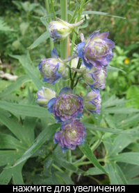Ярко-голубые с белой мушкой полумахровые цветки собраны в узкие плотные соцветия длиной 60-70 см . Общая высота растений с цветоносами достигает 120-130 см . Диаметр цветка - 5 см . Цвет очень яркий, сочный, какой-то безмятежно-голубой . Д . крупноцветковый (D . grandiflorum) Цветки простые, в метельчатых соцветиях . Листья изрезаны до узких долей .