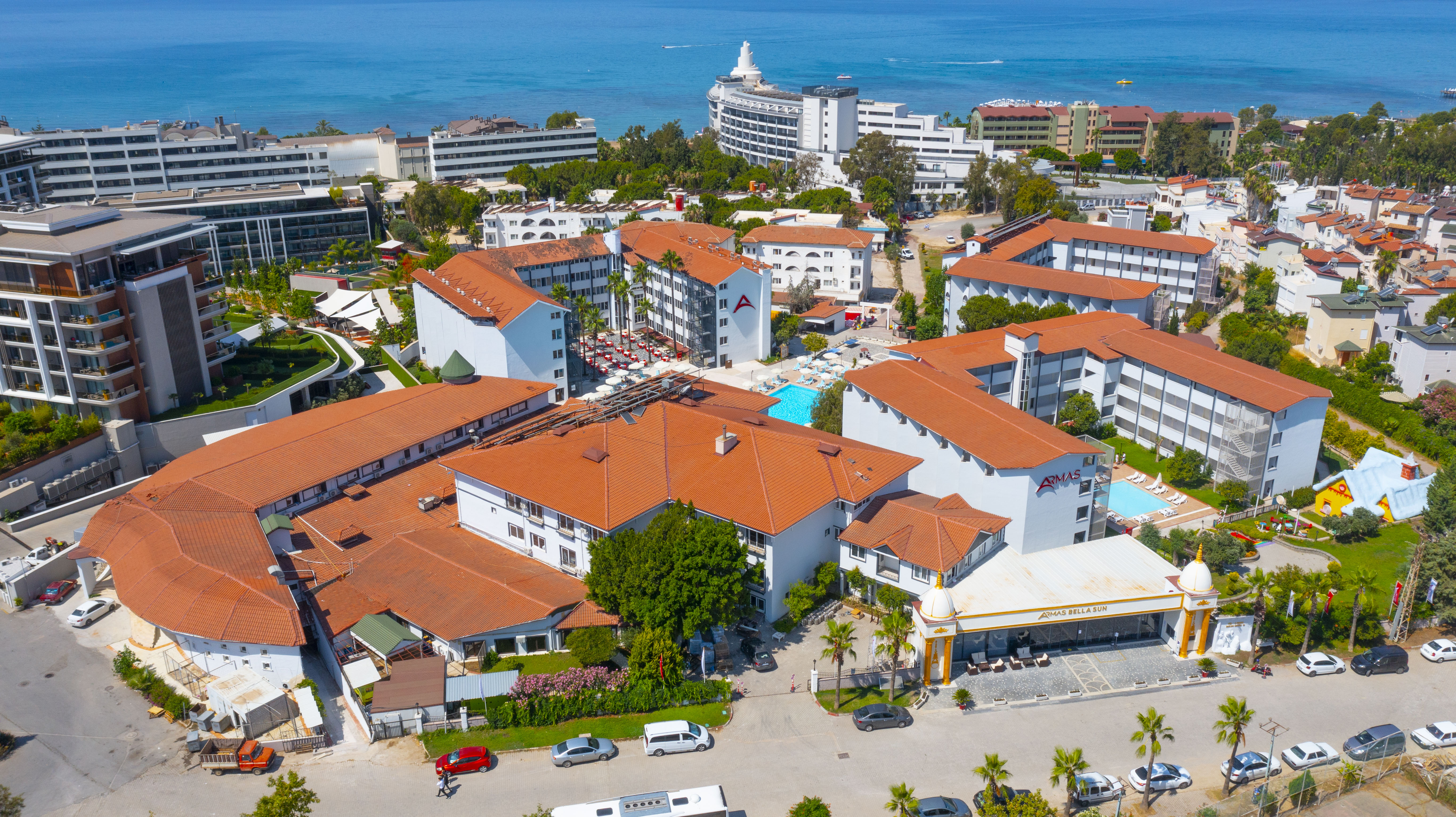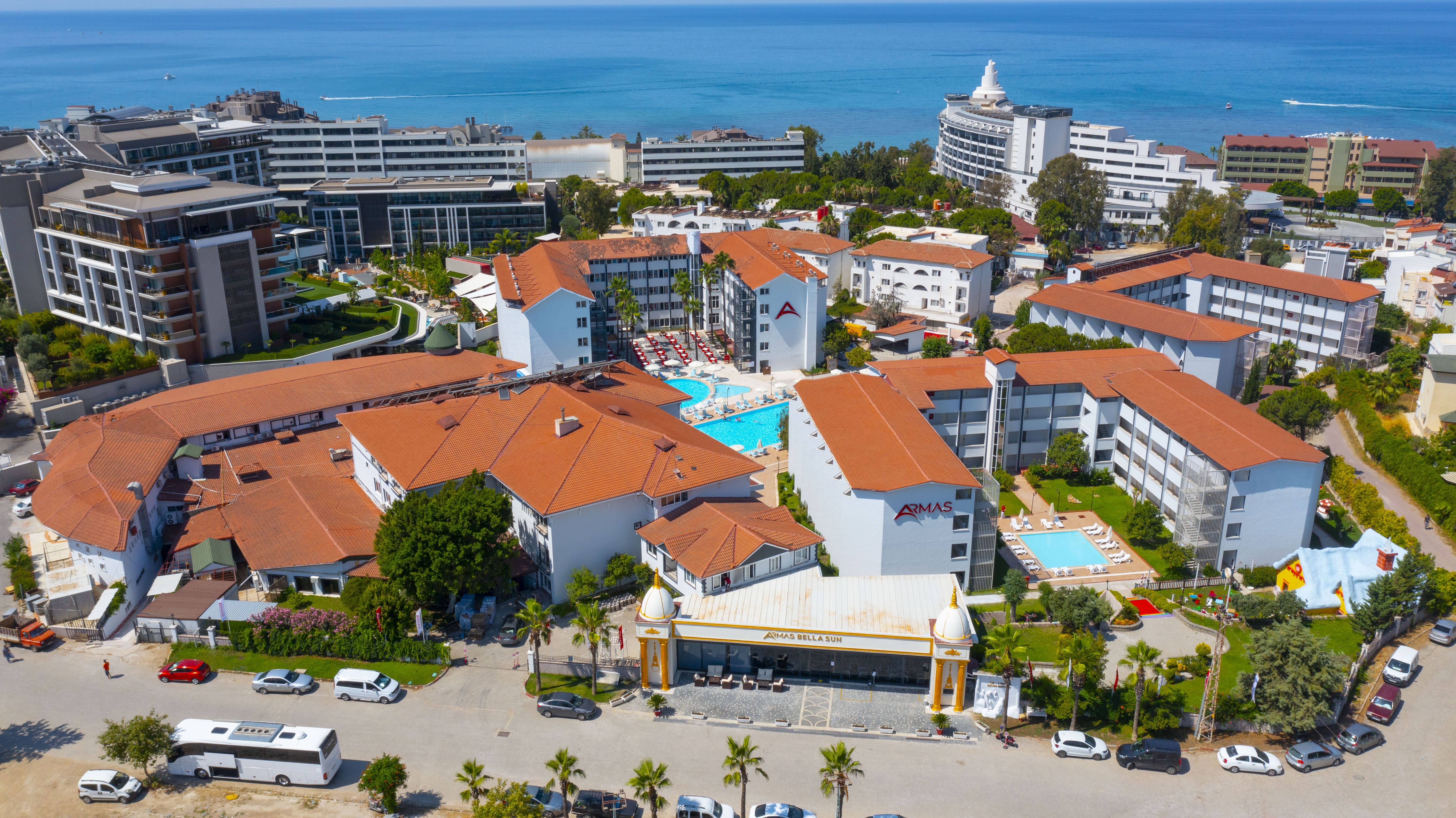 Территория отеля богата зелеными насаждениями . Жилой комплекс представлен 2-, 4- и 5-этажными корпусами . Предыдущее название отеля Armas Bella Sun 4* - Club Bella Sun Hotel & Spa 4* (Клуб Белла Сан Отель энд Спа 4*) .