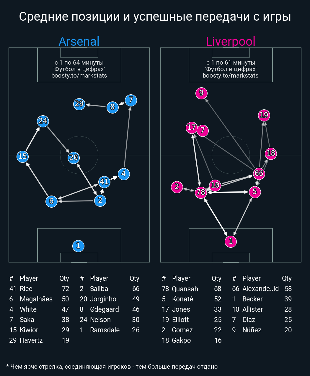 60 успешных передач из 70 попыток (6 с продвижением, 1 на трети соперника)