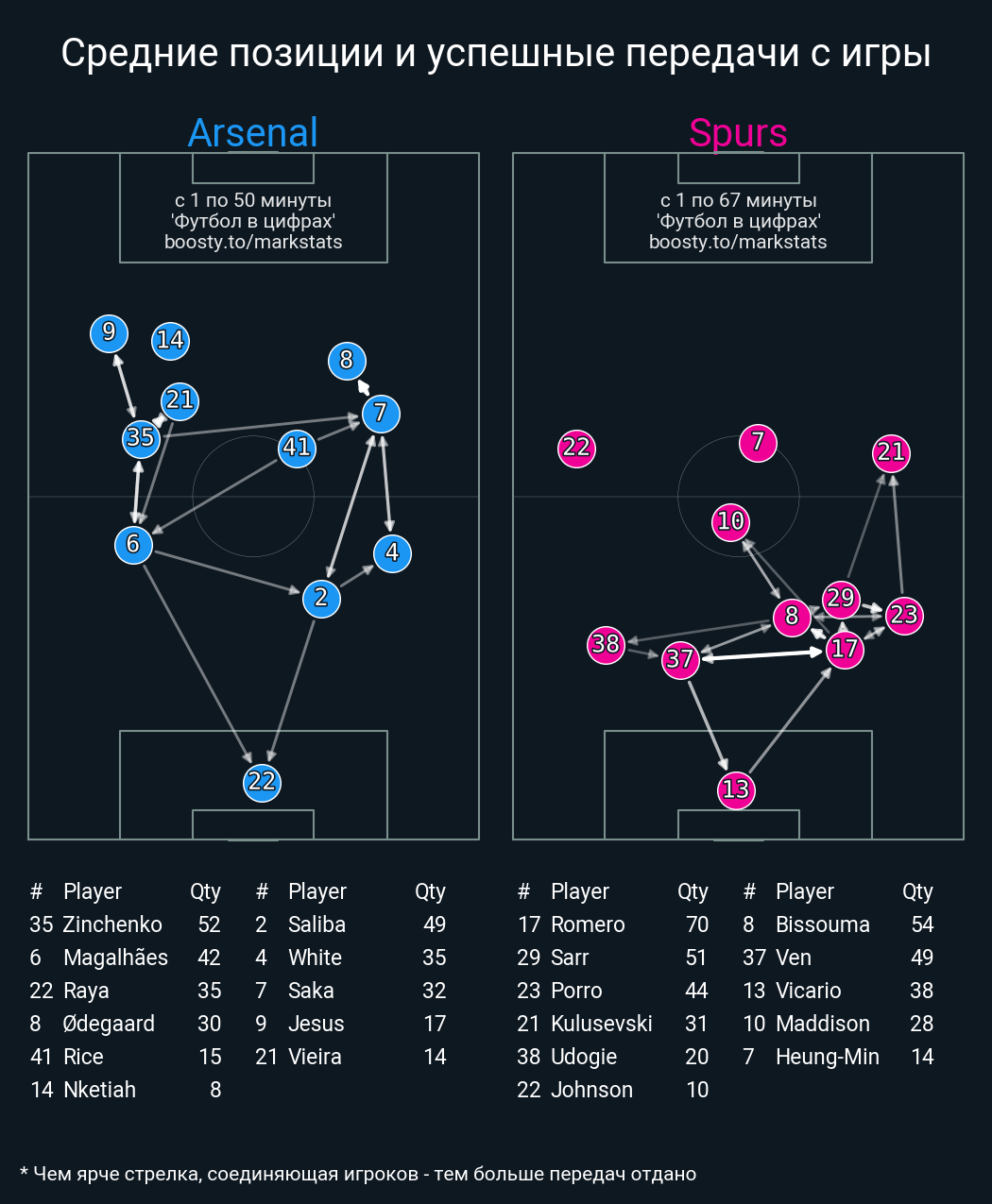 65 успешных передач из 70 попыток (4 с продвижением, 1 на трети соперника)