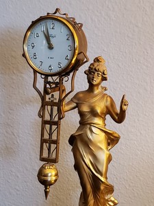 This is a wonderful old vintage clock that was called "The Bar Maid" Swinger Clock manufactured circa the 1930's - 1940's . The pendulum actually swings on the bar maid's arm and the clock is mechanical with a porcelain dial . The metal is not marked but appears to be brass and does show signs of age on the back .