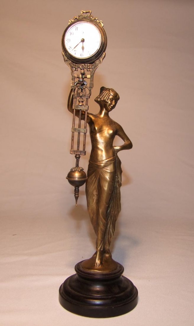 It stands 13 inches tall, with a clock with dial hanging from her right hand . The statue is brass and on a nice wooden base . The dial of the clock is porcelain with Arabic numerals . The whole clock swings back and forth as the clock is running, and it winds and sets from the rear of the clock .