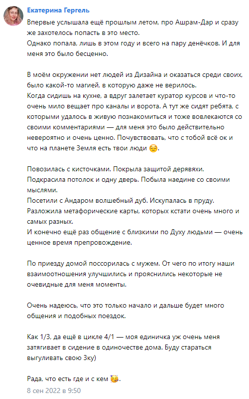 Главный ресурс Ашрам-Дара - это люди в осознанности и темах саморазвития, психологии и познания мира, в эксперименте с Дизайном человека и Генными ключами. Здесь встречаются индивидуальности без масок, обязательств и ожиданий. Всегда есть, кому открыть душу и в чью окунуться в ответ.
