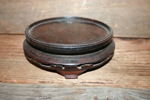 Delicate and beautifully carved Antique Asian wood stand, raised on 5 legs . The platform which has a recessed ledge measures 2 3/4" in diameter and the exterior measurement is 5" in diameter with a . . .